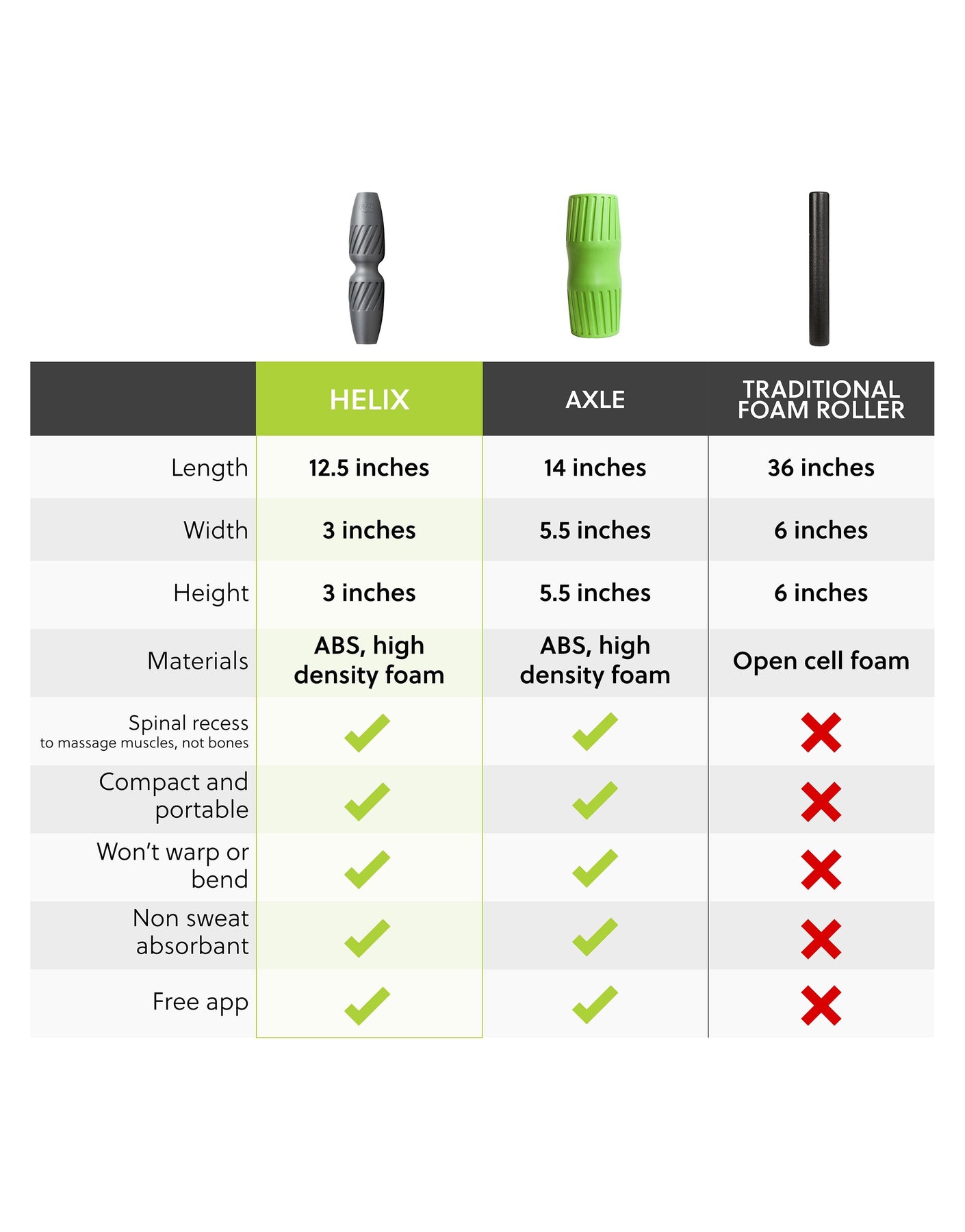 The Helix flushes out toxins and enhances your back’s range of motion with its anatomical shape. It's designed to protect the spine because we think it's kind of important! Your foam roller definitely can’t do that. Oh, and did we mention it’s also killer on calves, quads, hamstrings and hips?