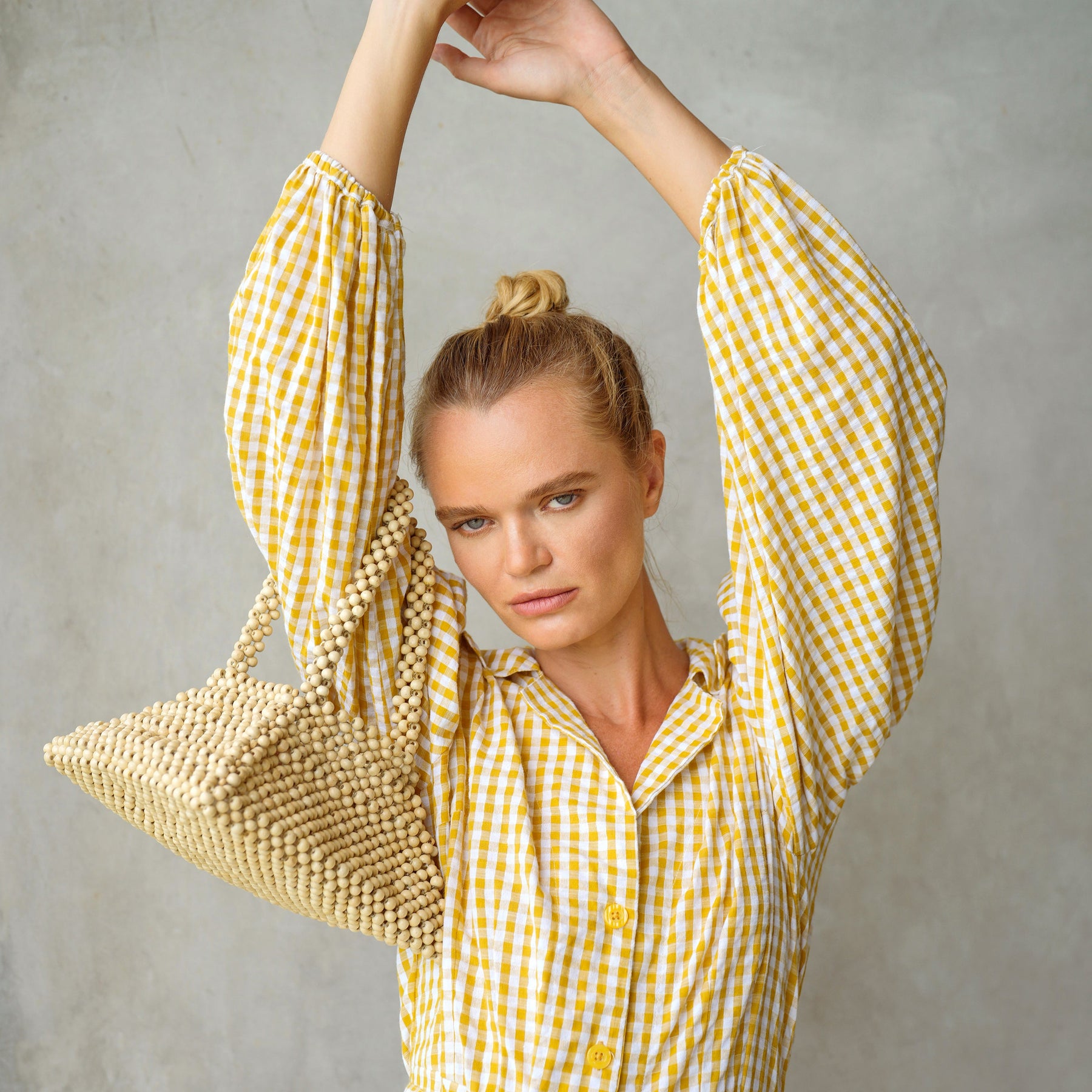 This Pyramid bag is a museum-worthy, sculptural beads piece that strikes a cool, coastal ease. Crafted of natural wooden beads, this arm purse features a sturdy 3-dimensional pyramid shape with 2 bag handles. Show yours off with our Meghan mini gingham dress and your favorite espadrilles.
