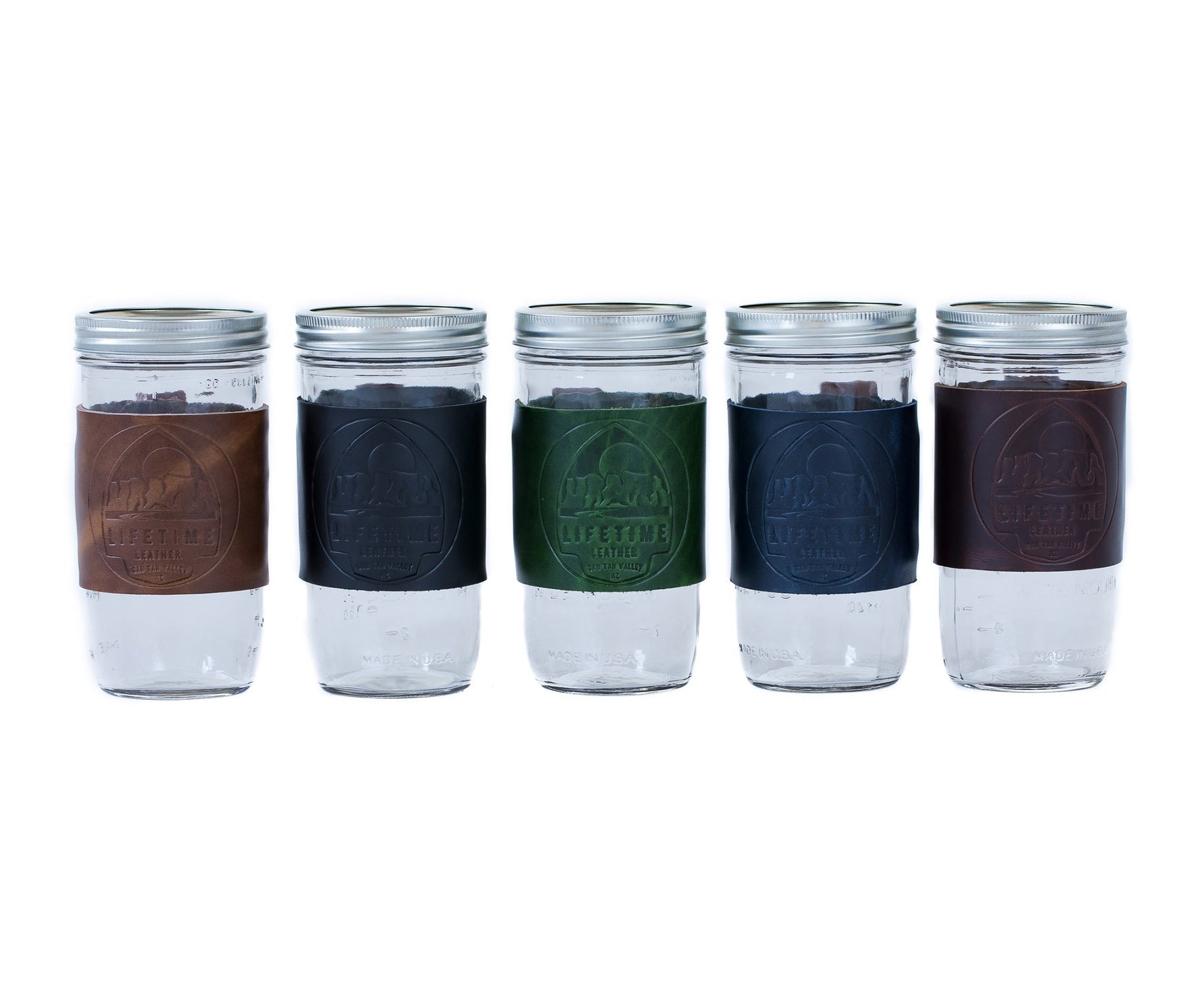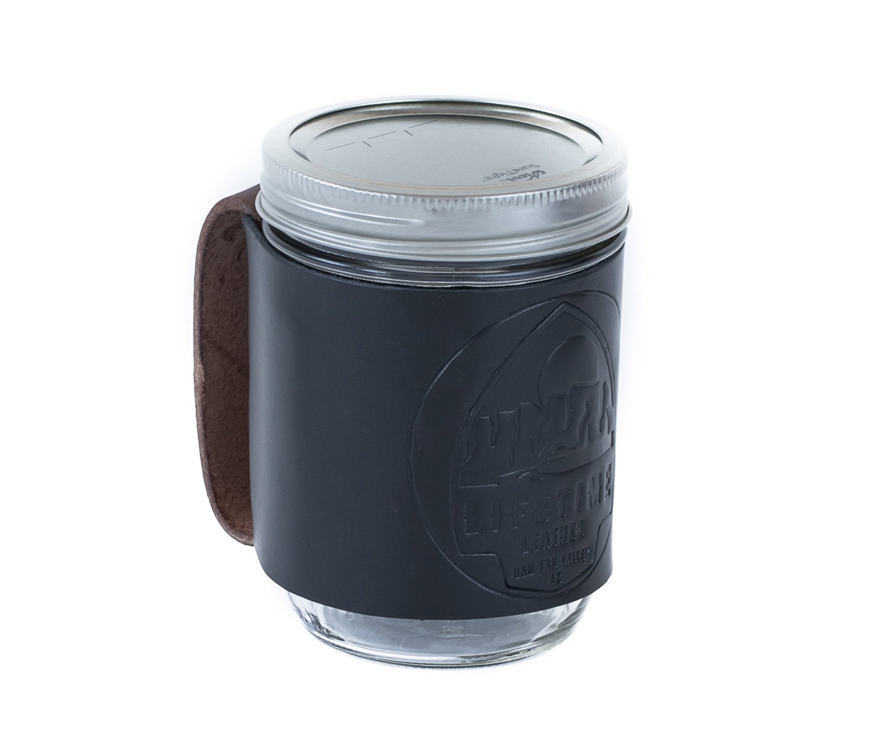 Add a dash of handsome to your morning coffee ritual with this leather mug wrap. It hugs your Mason jar to keep your hands burn free and take hot or cold drinks on the road. Each koozie is hand stitched, comes with a handle, and includes a free mason jar and lid.