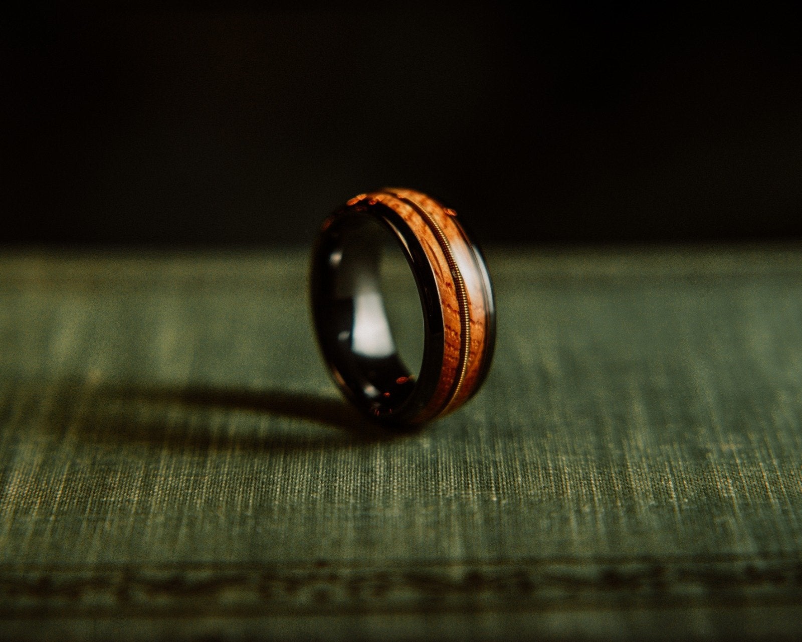 You like the finer things in life and enjoy experiencing your drink, cigars, and food with expertise precision. Others call you a bourbon or cigar “aficionado” and you wear the title proudly. Add to your personal brand with a ring that makes a statement in design and craftsmanship. The “Aficionado” features the beautiful aged oak wood from a used whiskey barrel, and is coupled with a brass guitar string inlay and scratch resistant black ceramic metal.