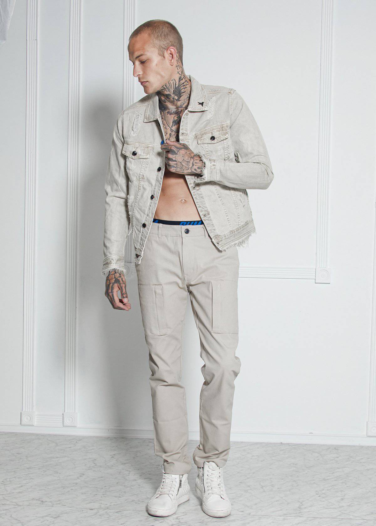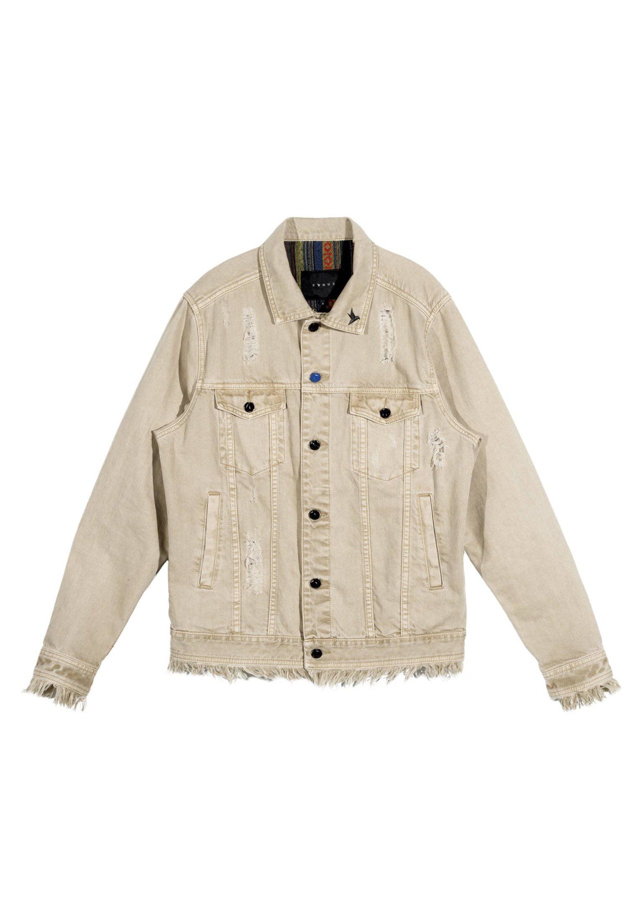 Mens garment dyed bull denim jacket with frayed at cuff and hem edges.