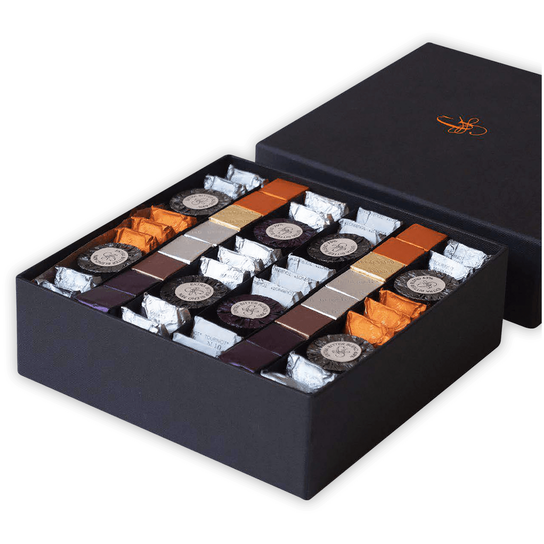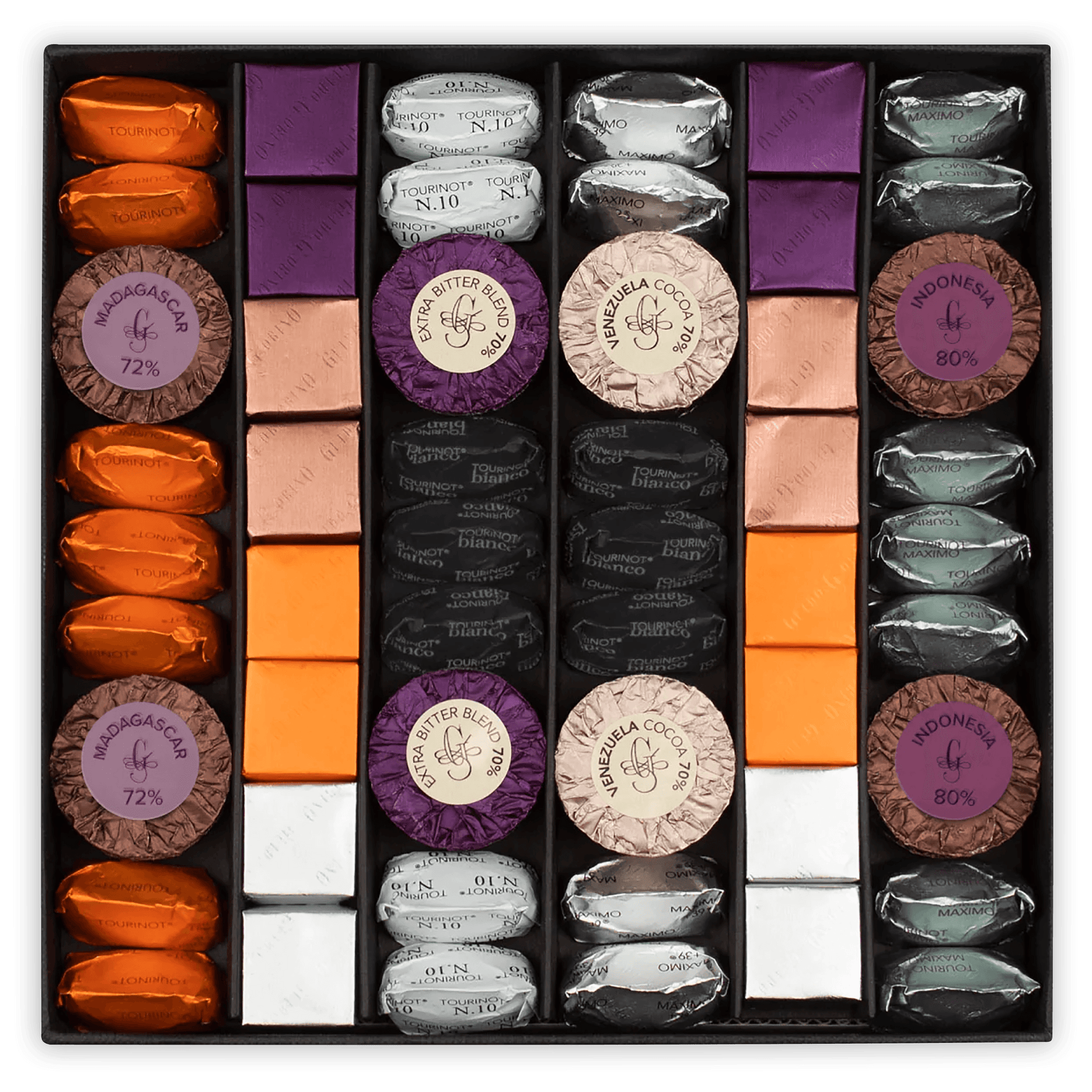 An assortment of Guido Gobino's two recipes of Giandujotto, with and without Milk, is packed in a very elegant box. This Giandujotti are made with selected ingredients, such as aromatic cocoas from South America, the famous Piedmontese Hazelnuts, and exclusively Italian milk. Produced with the original method of extrusion that gives every Giandujotto its unique shape. Approximately 52 pieces prepacked.