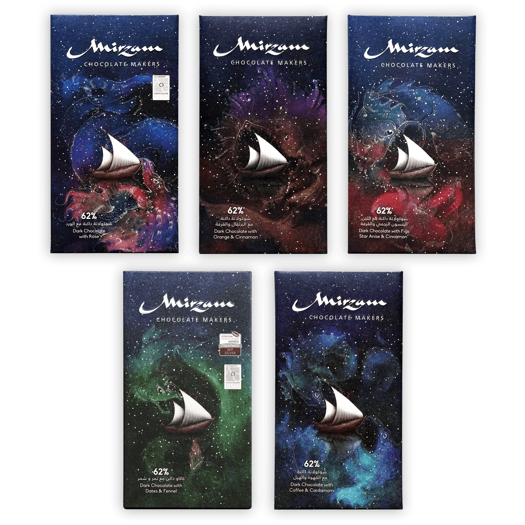 Inspired by the Spice Route, this collection of chocolate bars showcase Mirzam's dark chocolate with natural spices. All of these bars are naturally gluten free and vegan.
