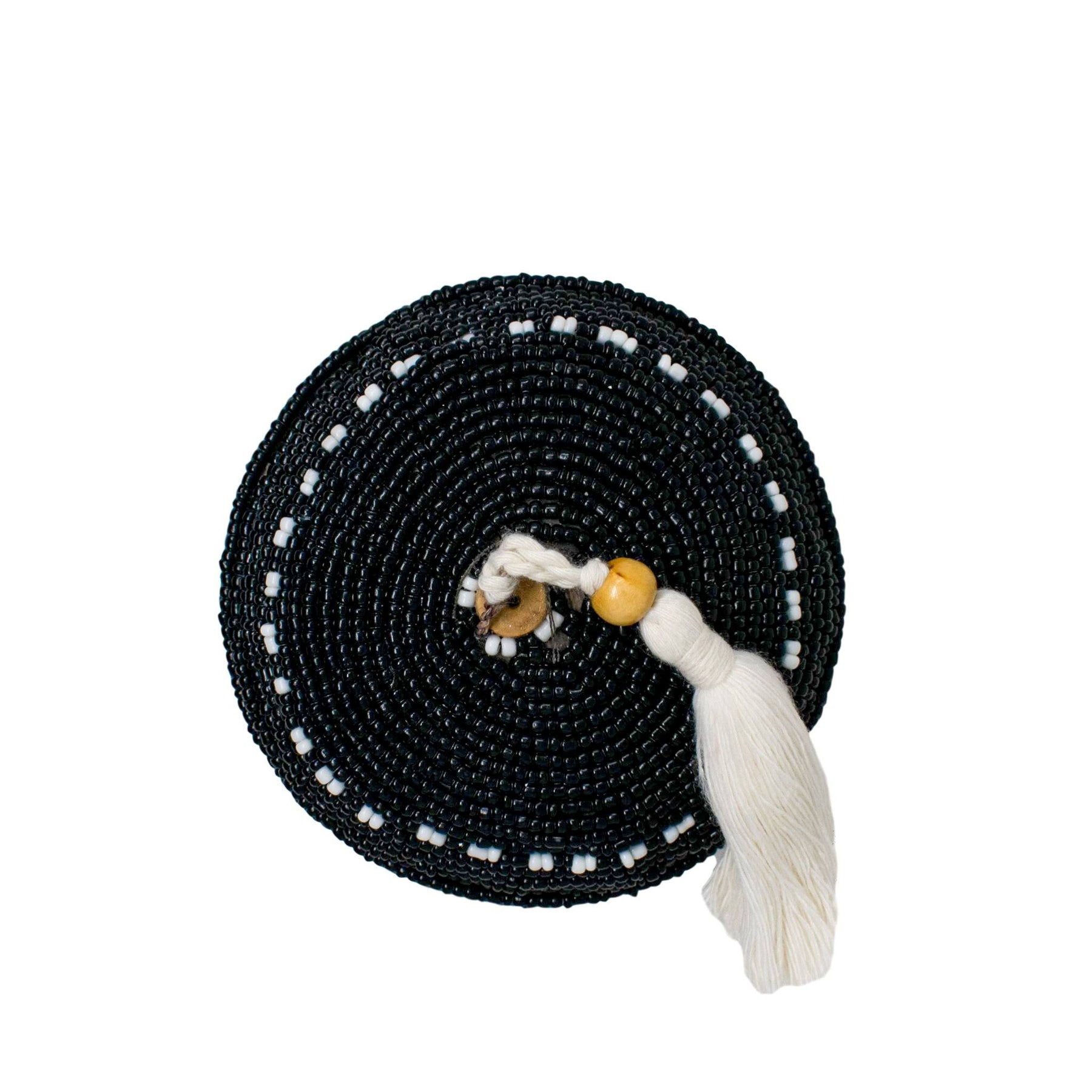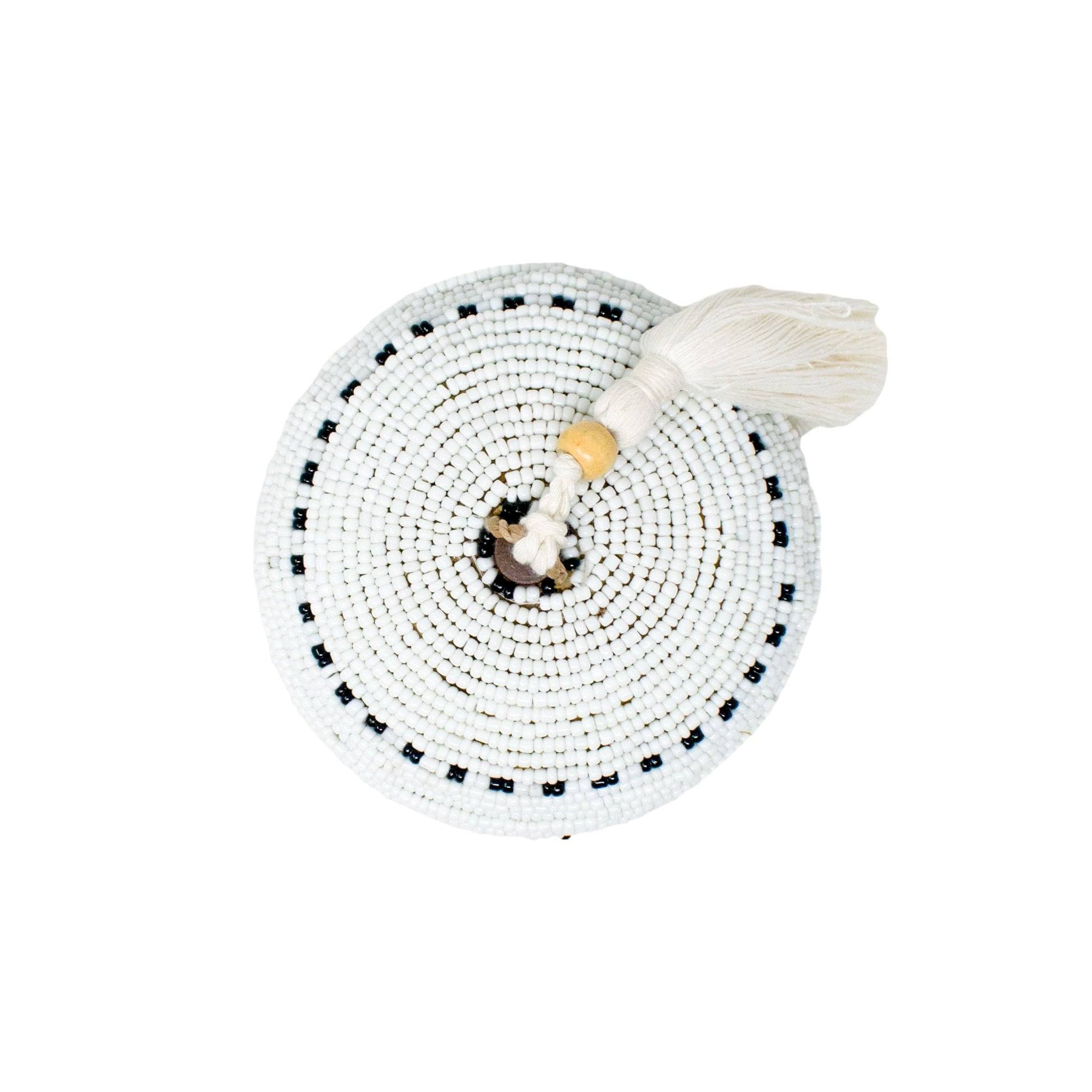 A beautiful hand-beaded small bowl with a lid and fun tassel feature!