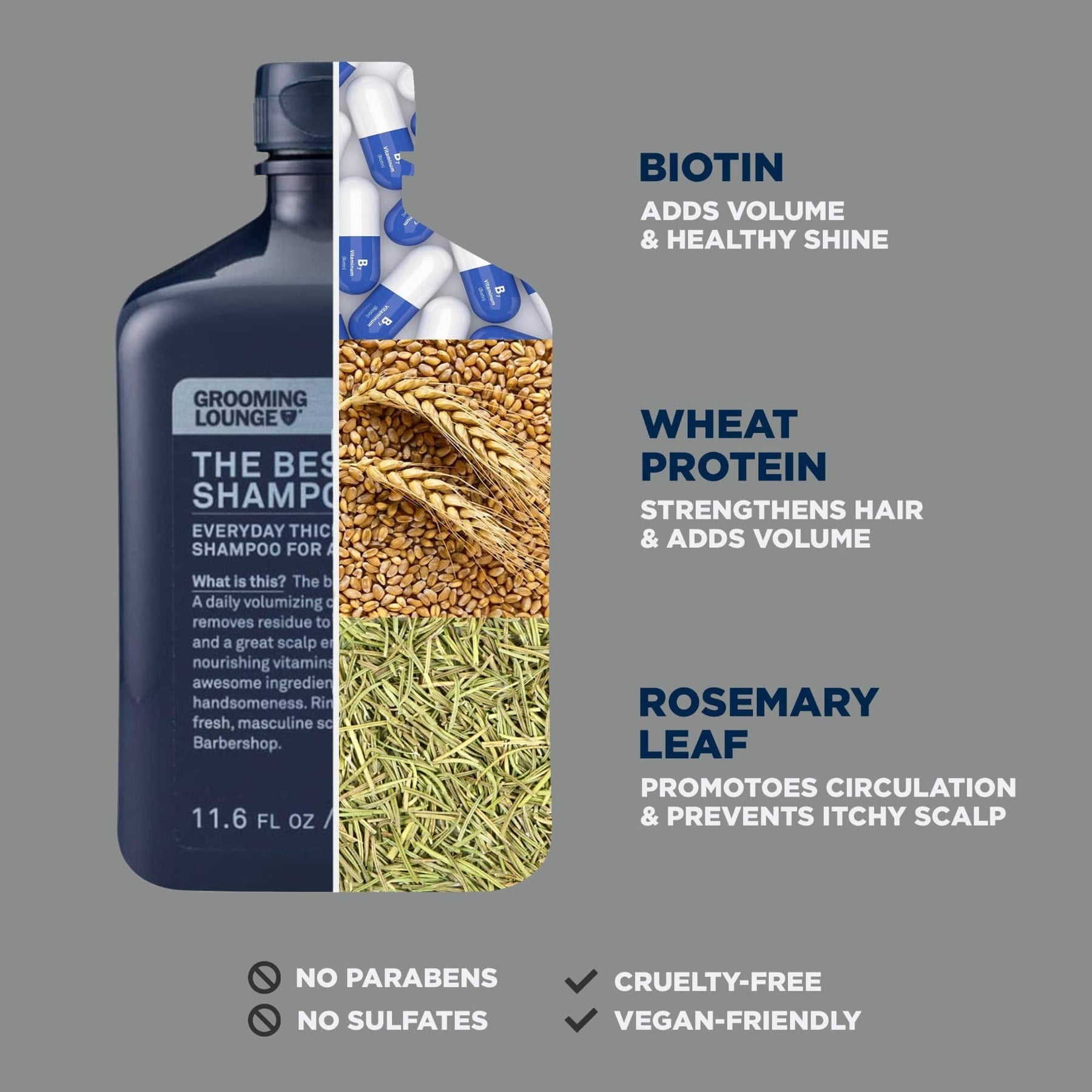 Grooming Lounge The Best ShampooThe best daily-use shampoo period. A daily cleanser that gently removes residue to promote healthy hair and a great scalp environment. Stimulating peppermint scent smells great and imparts just-right tingle. Contains basically anything that can gently clean and possibly help a guy hold onto his hair. Developed in our Barbershop by real barbers and other smart humans.