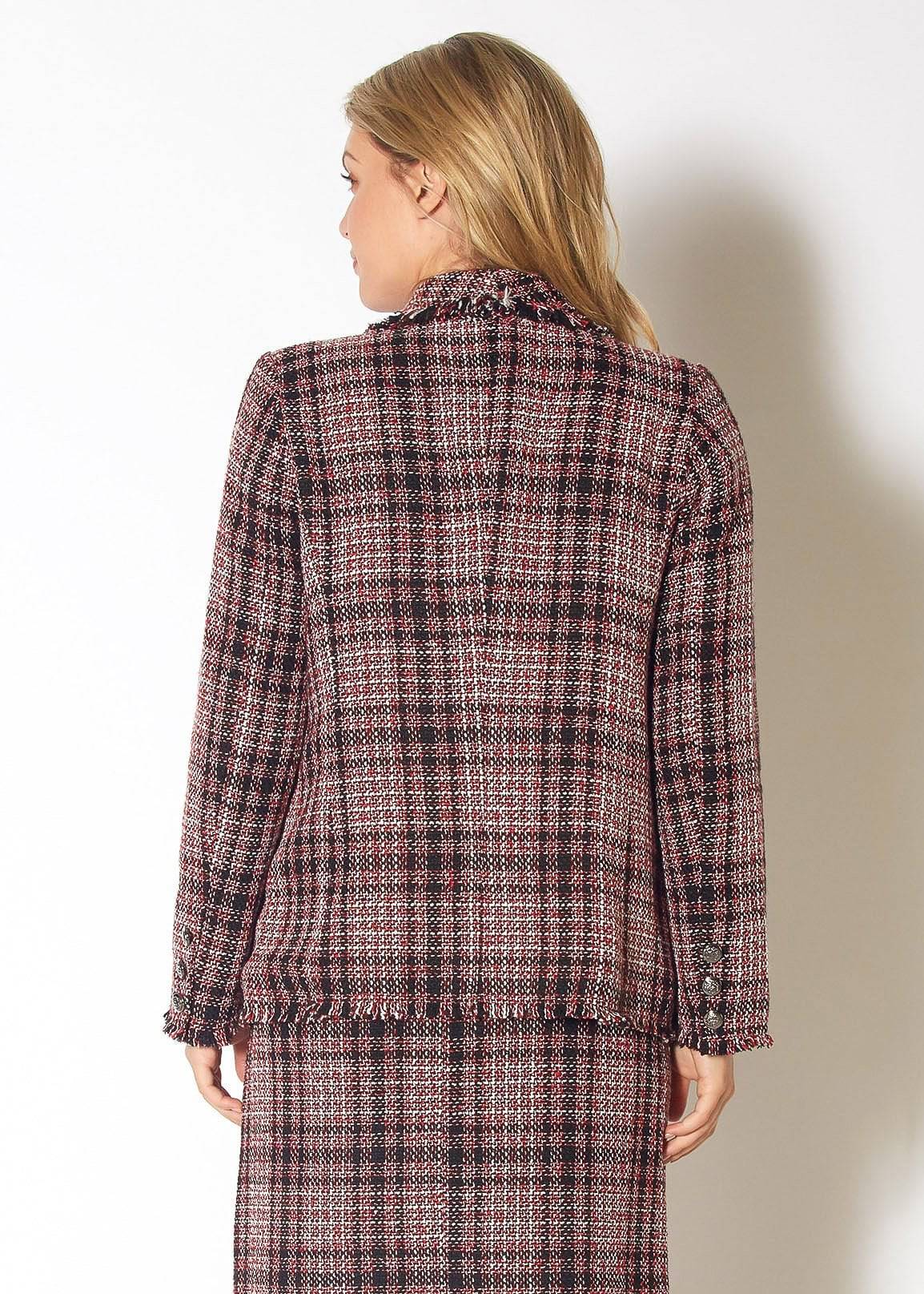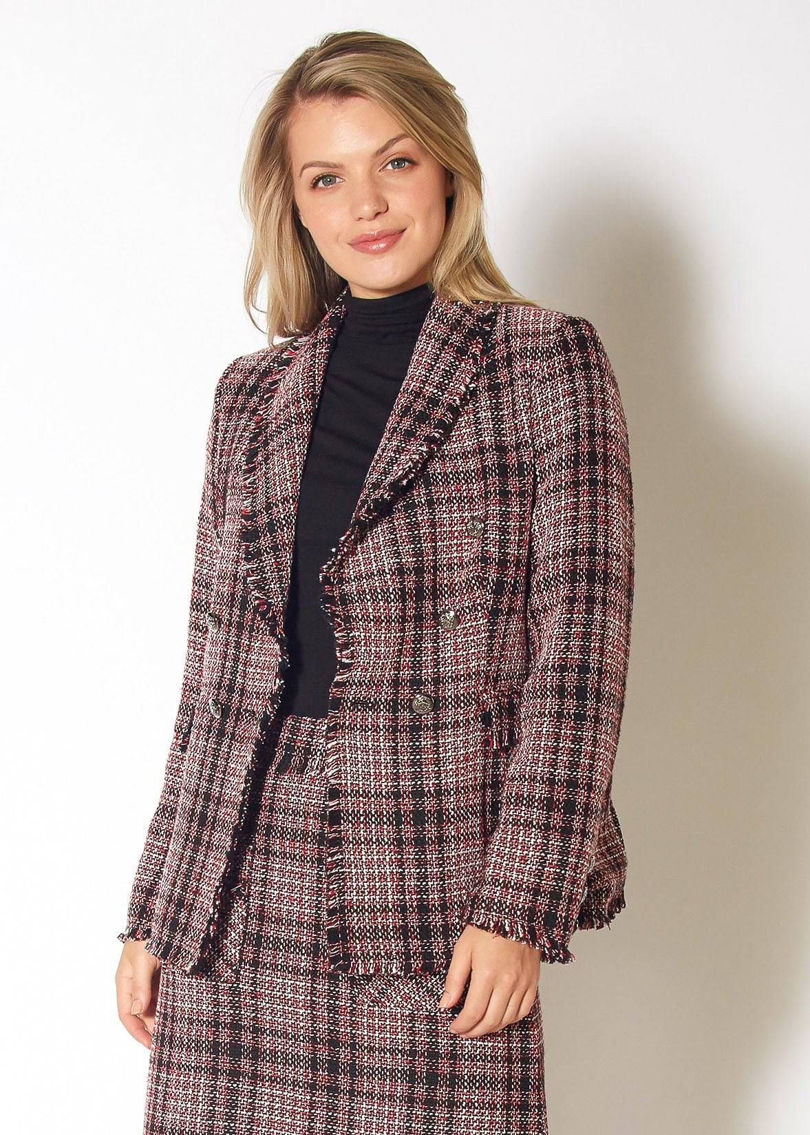Cozy plaid tweed blazer jack with fringe trim hem and Flap pockets 100% Polyester