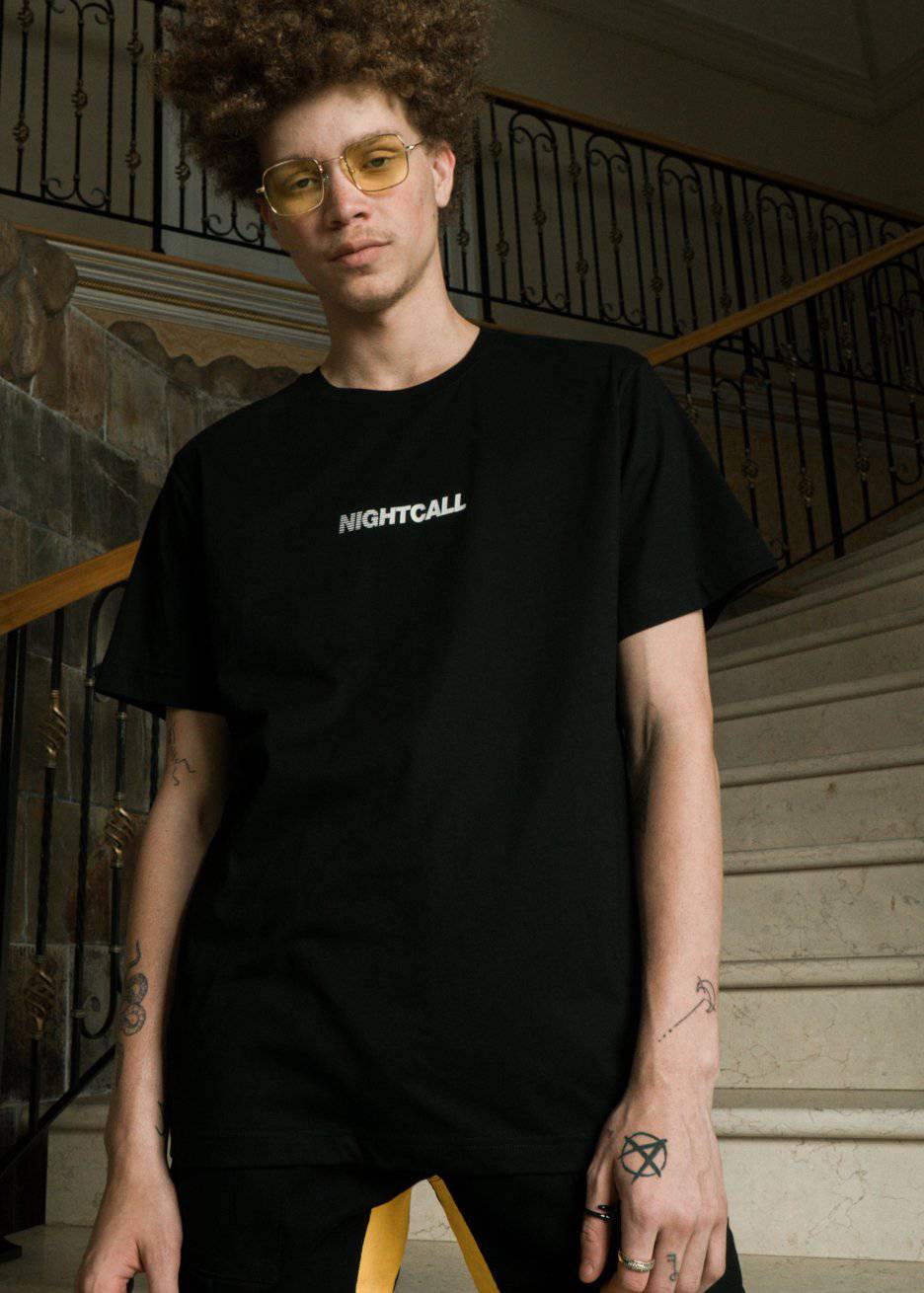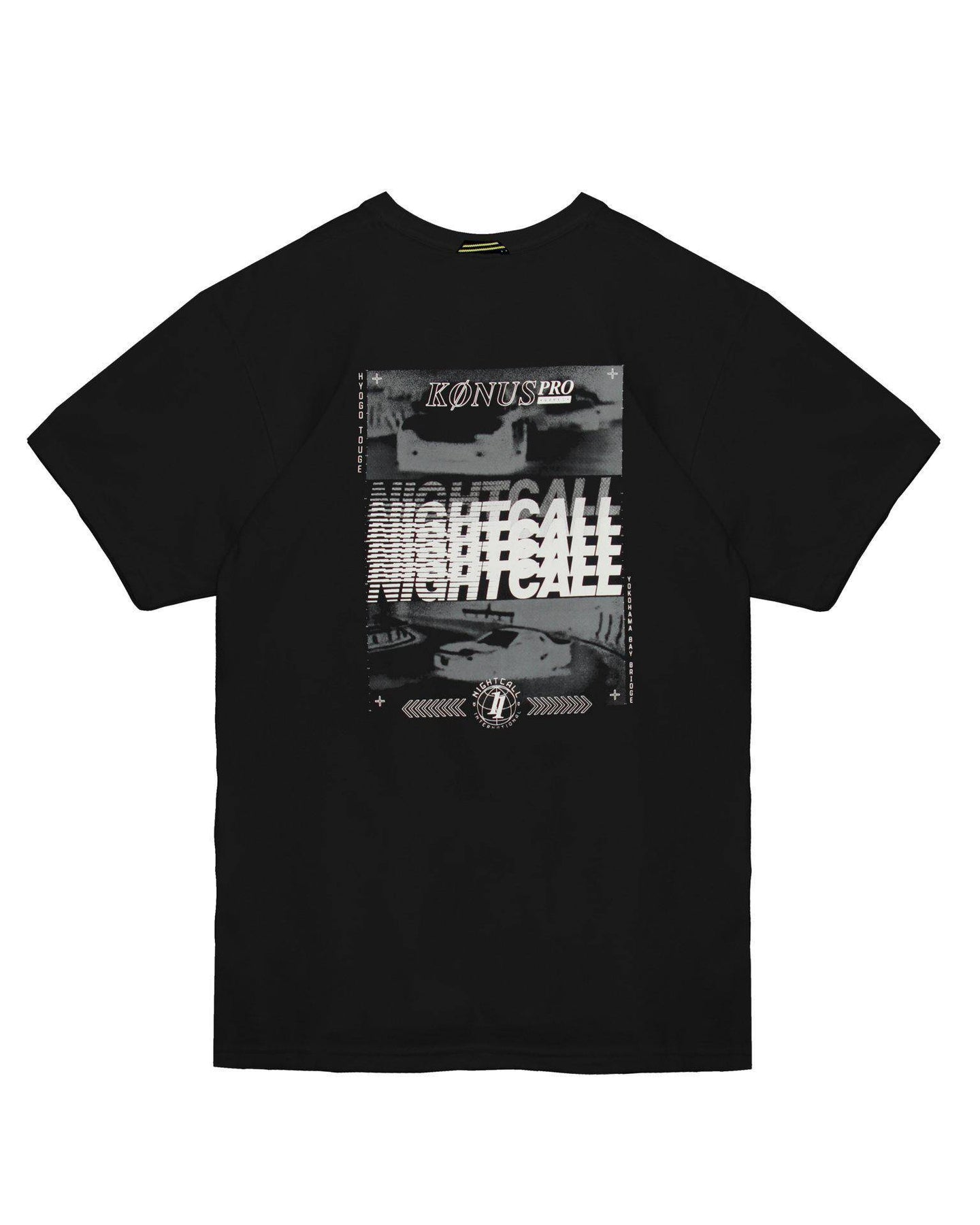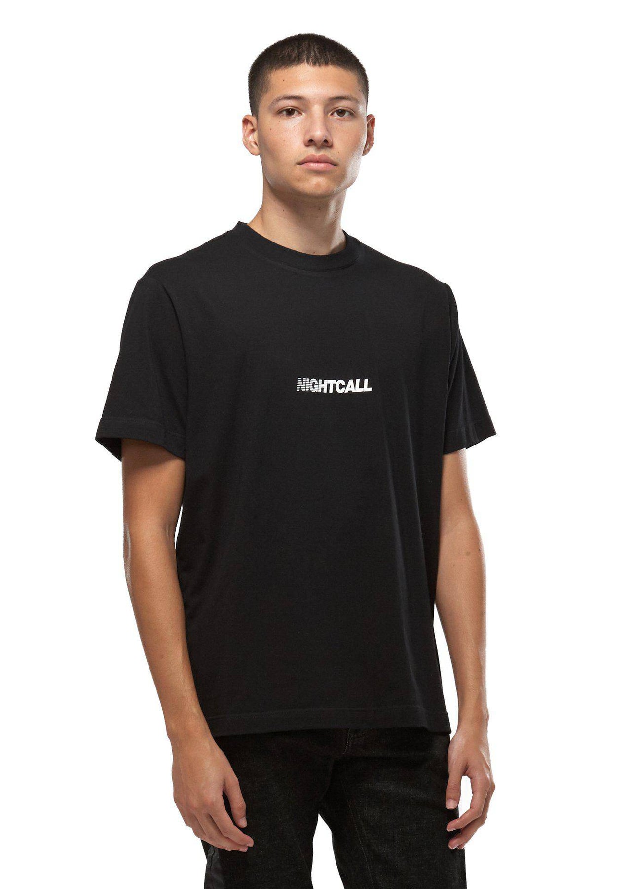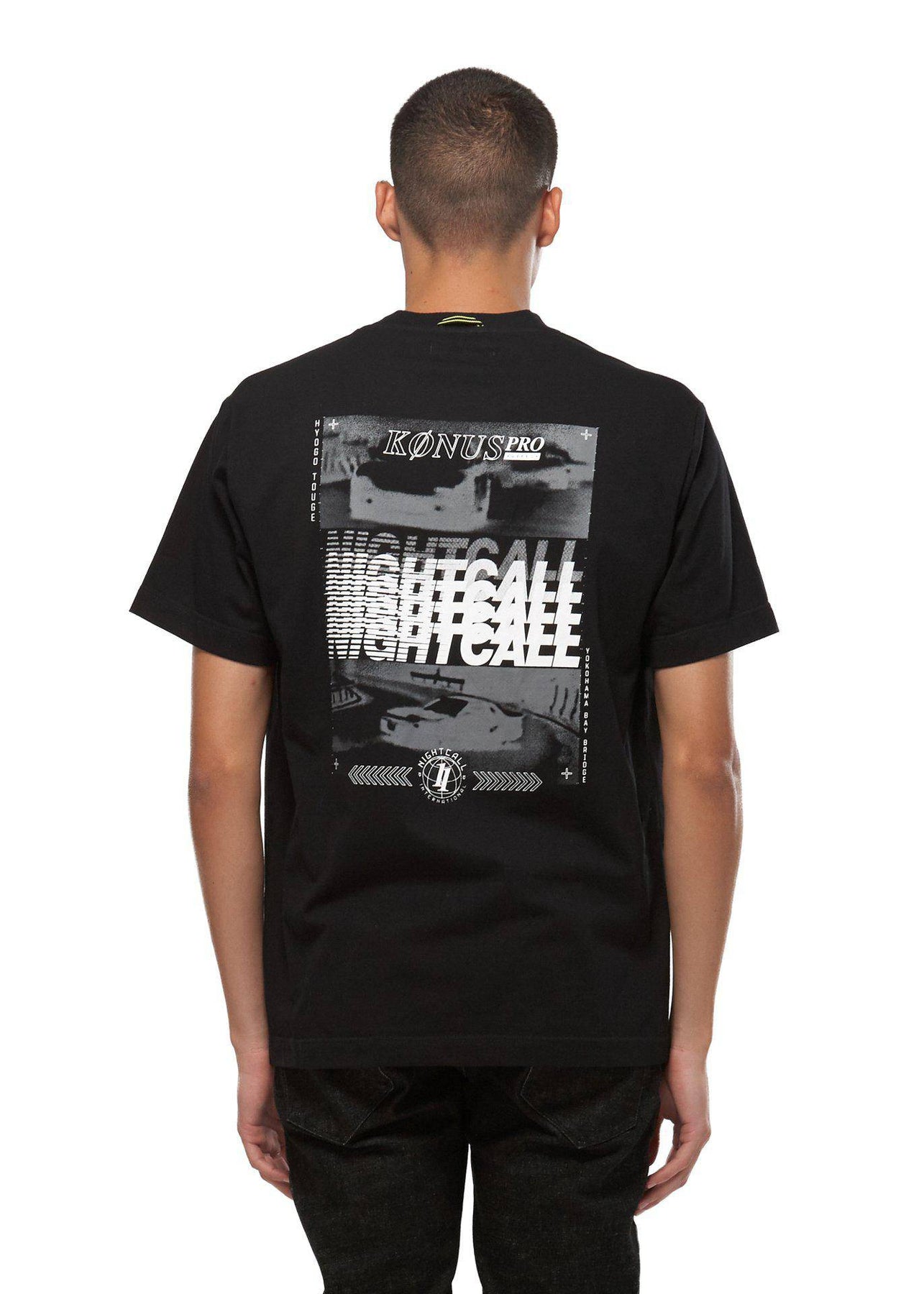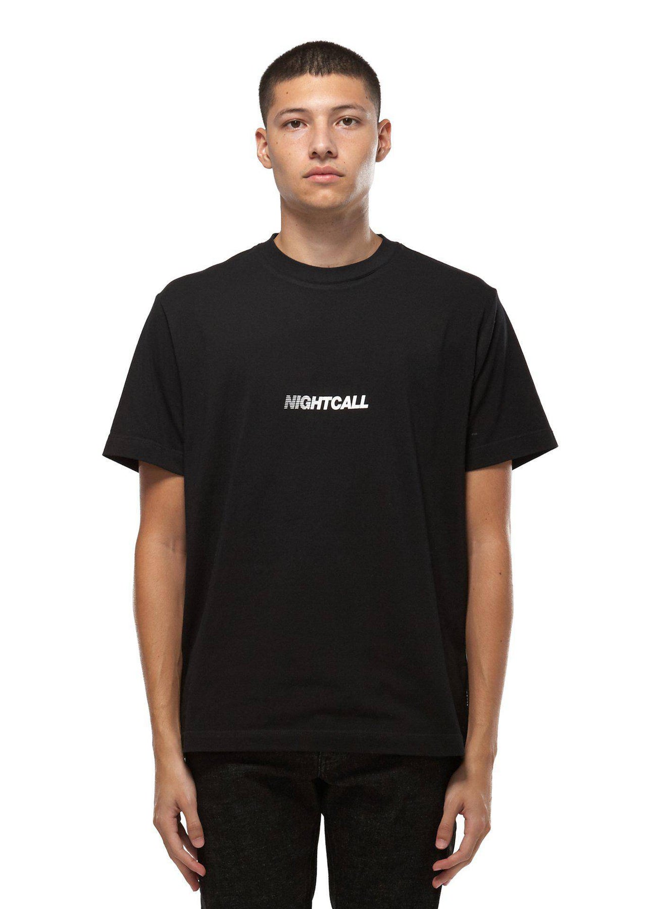Short sleeve crewneck tee shirt with screen print on chest and back.