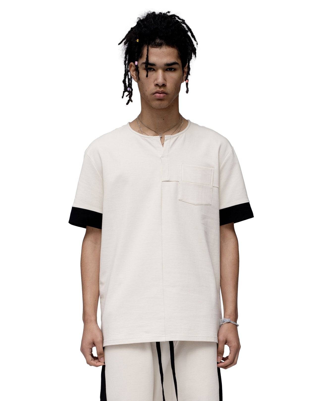 Short sleeve henley with chest pocket with seam detail and contrast color cuffs