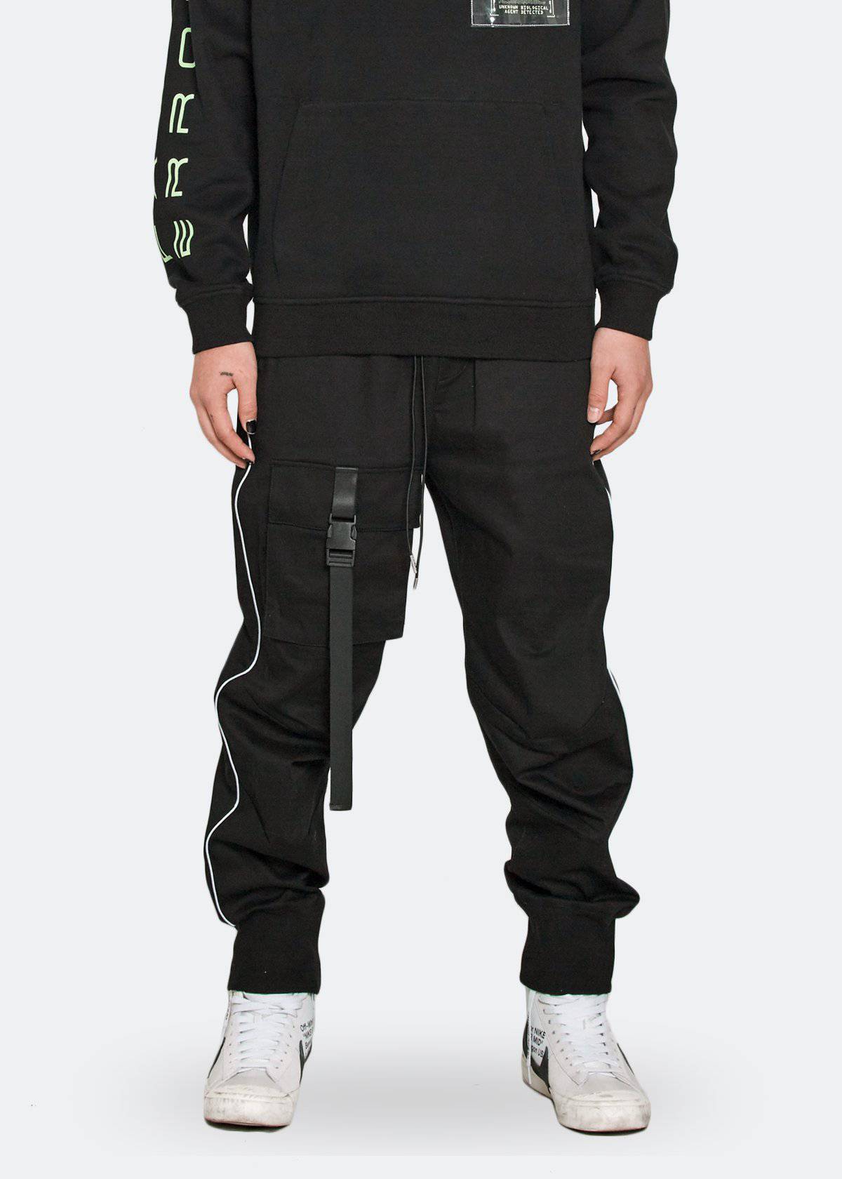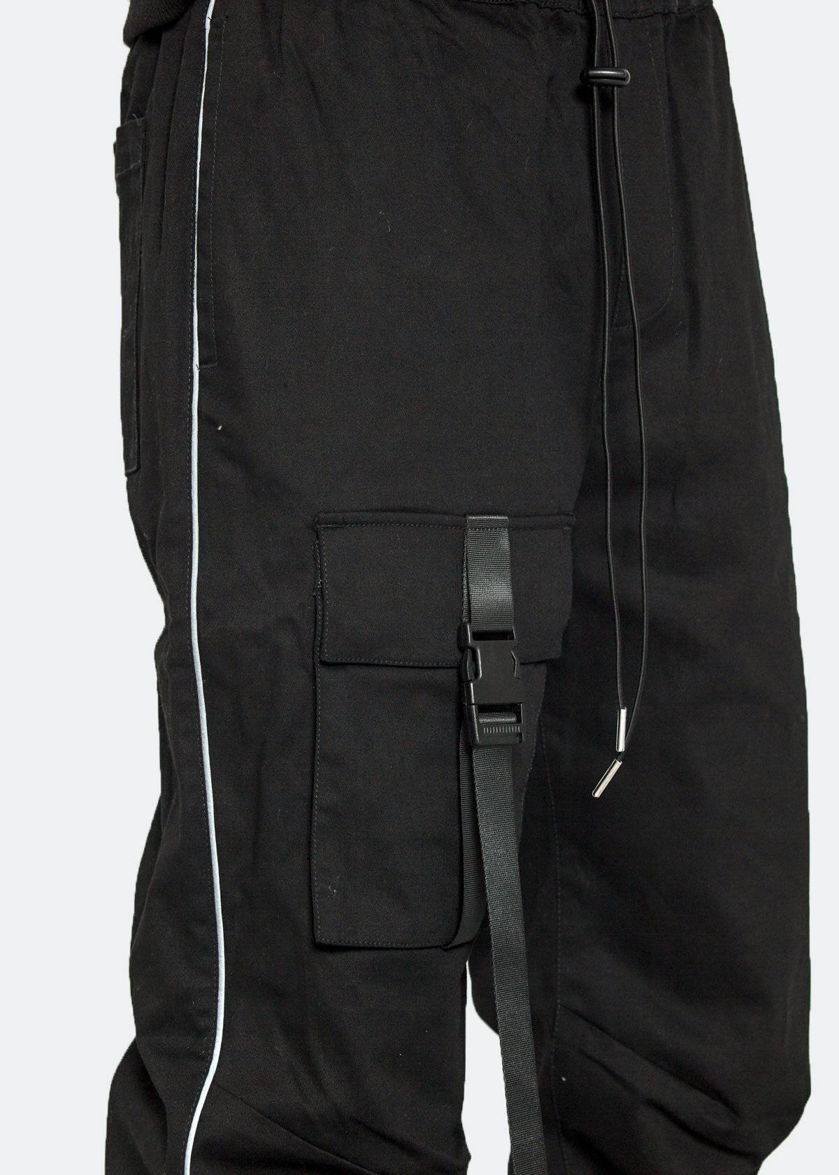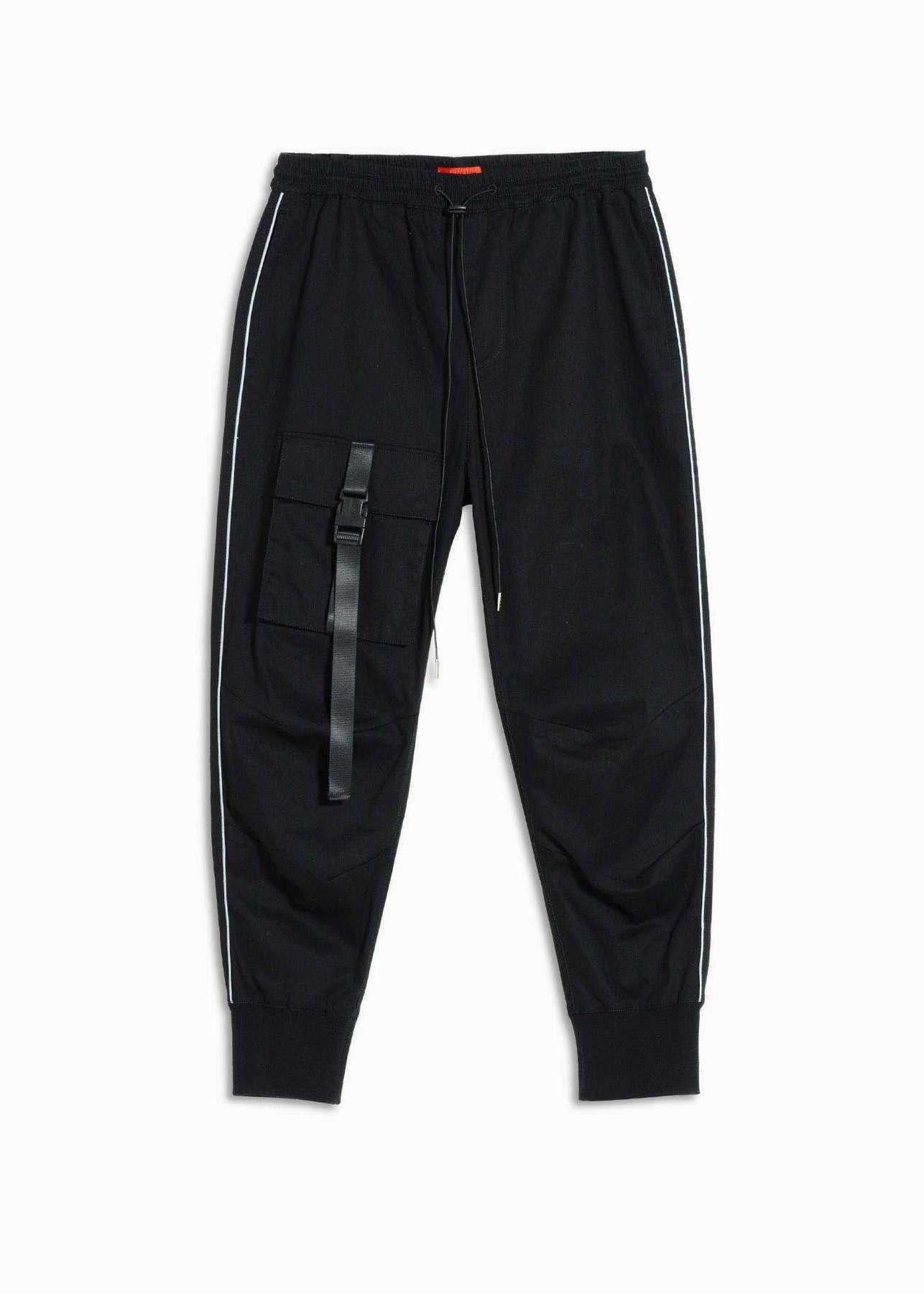 Elastic waist-banded jogger with rib cuffs comes with cargo pocket with nylon tape and buckle closure and reflective piping at side seams.