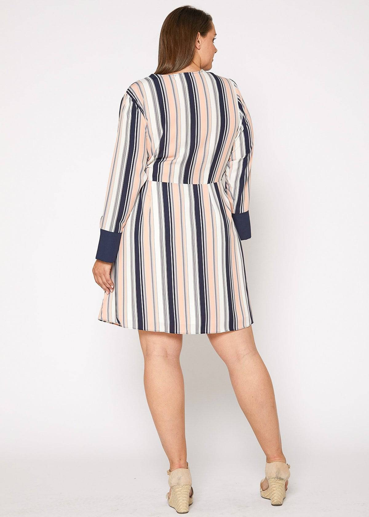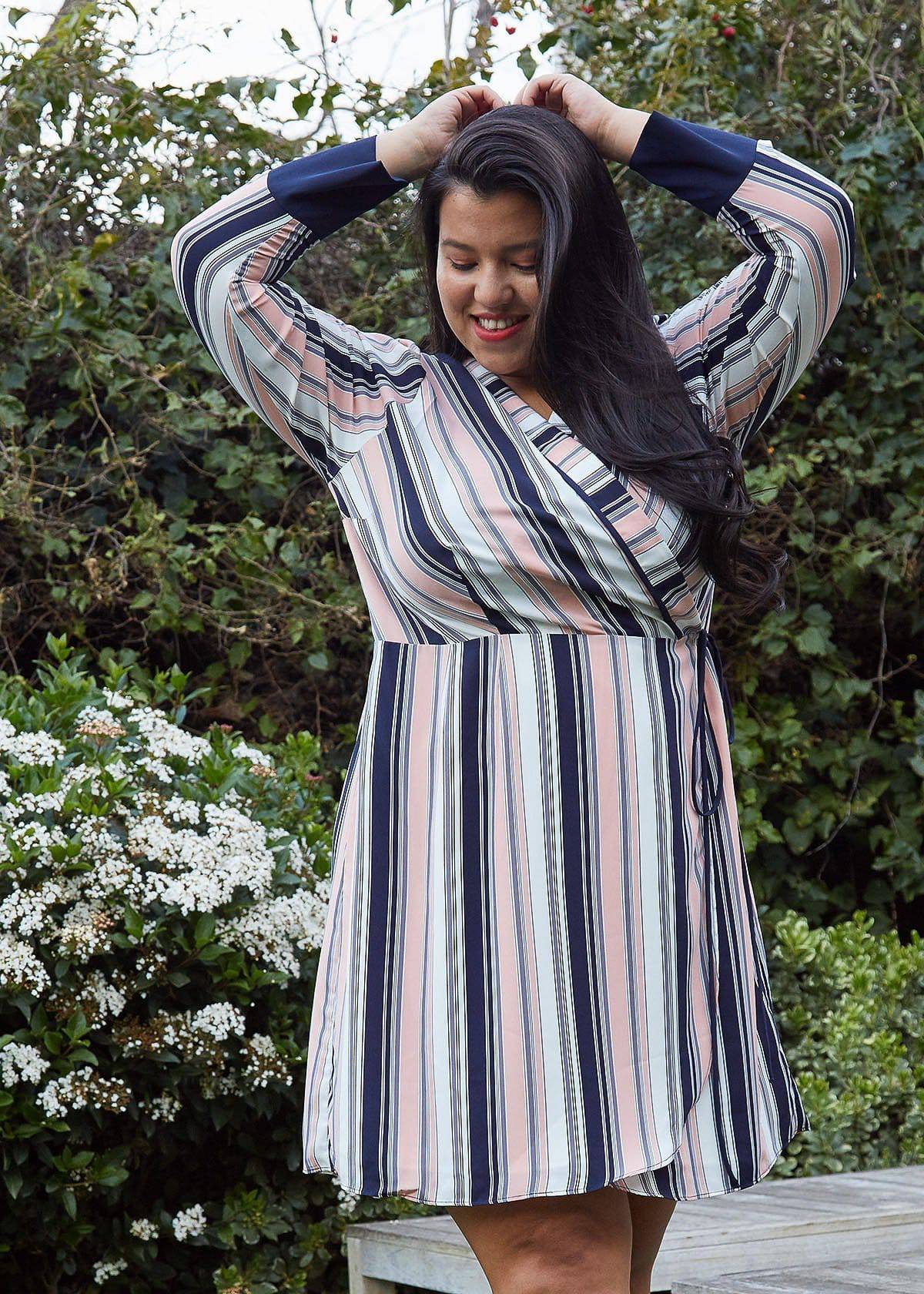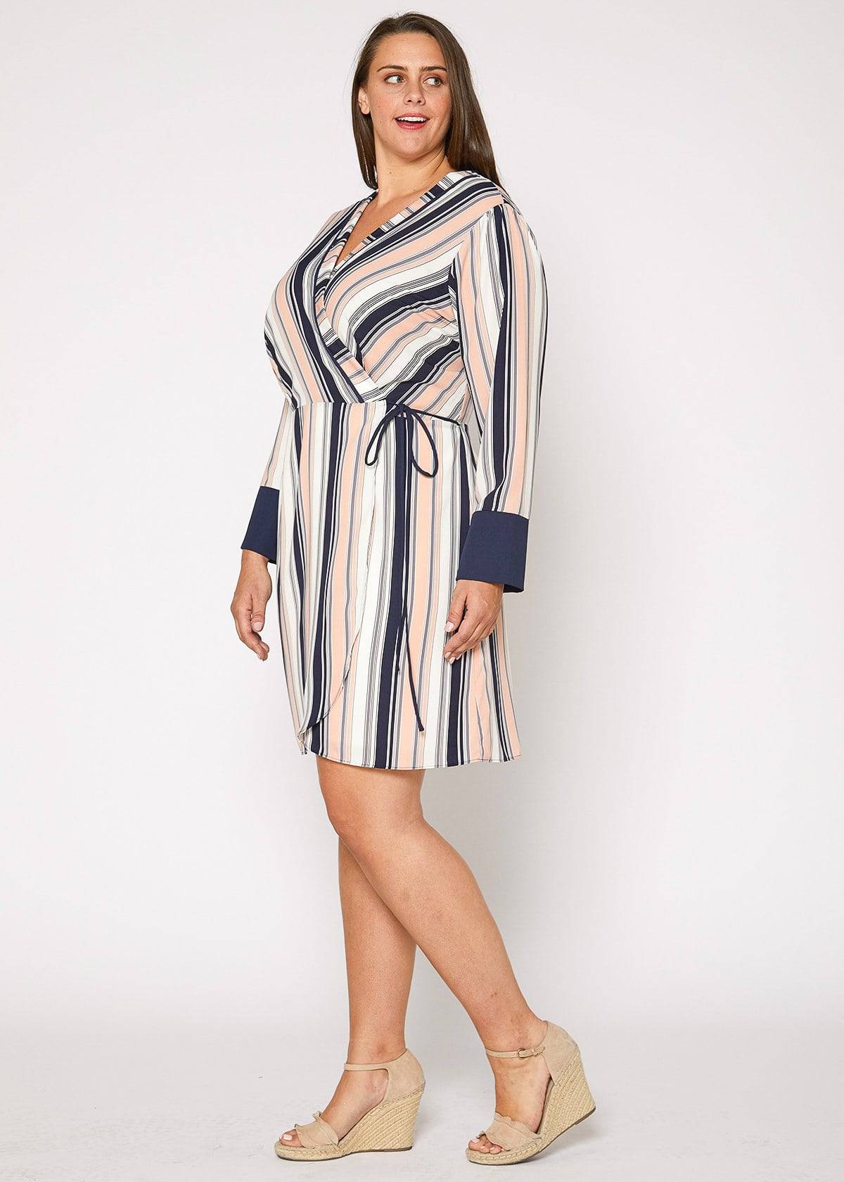 Nurode Multi Stripe Printed Long Sleeve Wrap Dress With Cuff Binding Waist Tie DetailModel wearing size XL