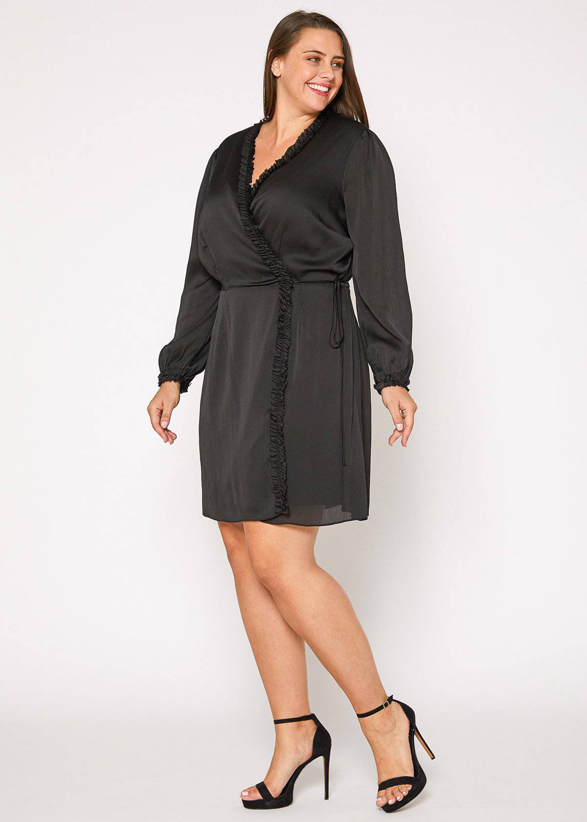 Nurode Ruffle Trim Long Sleeve Wrap Mini DressSELF:100% POLYESTER LINING: 100% POLYESTERModel Size: SMALL