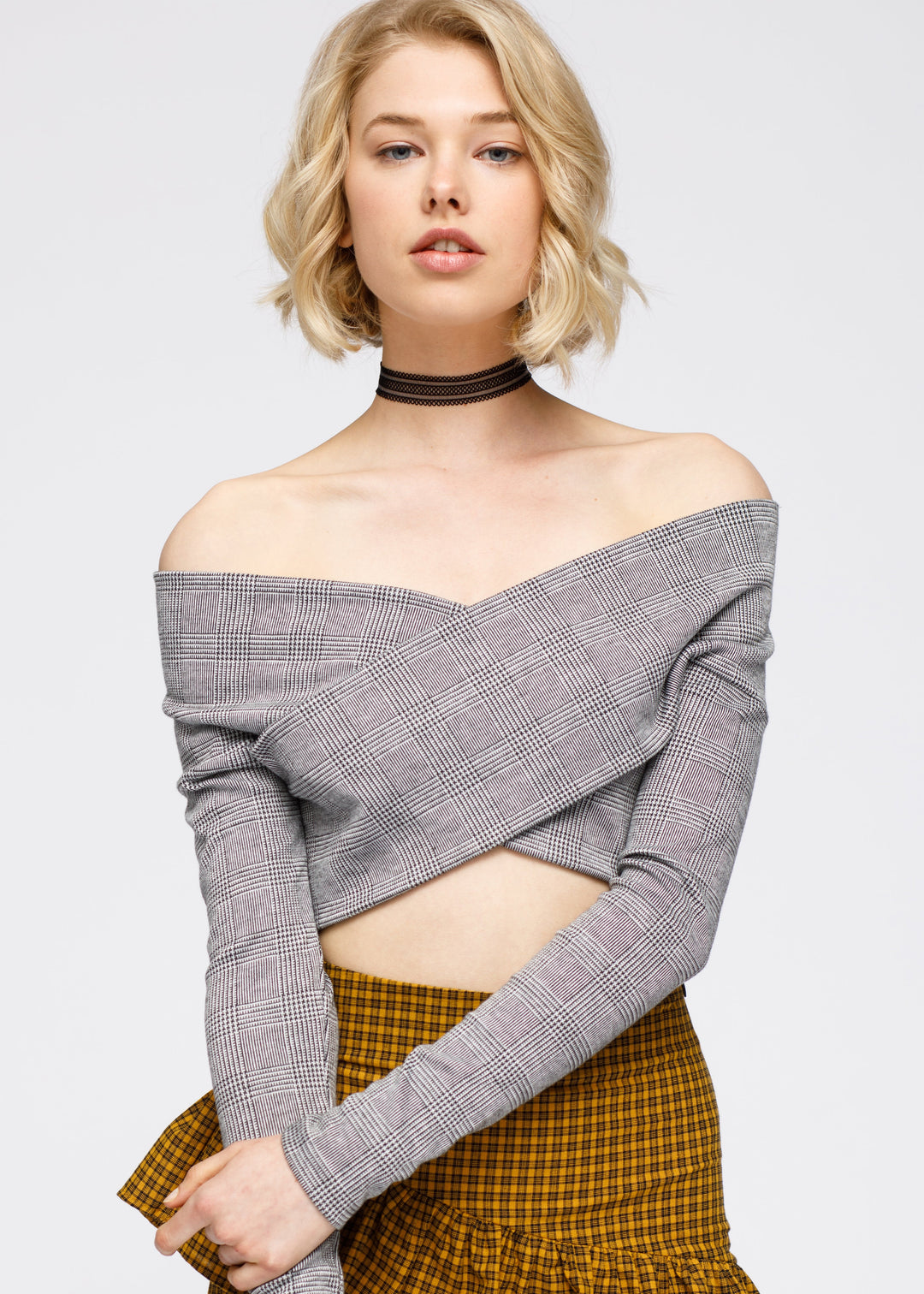 Glen Plaid Off Shoulder Crisscross Crop Top In Grey by Shop at Konus