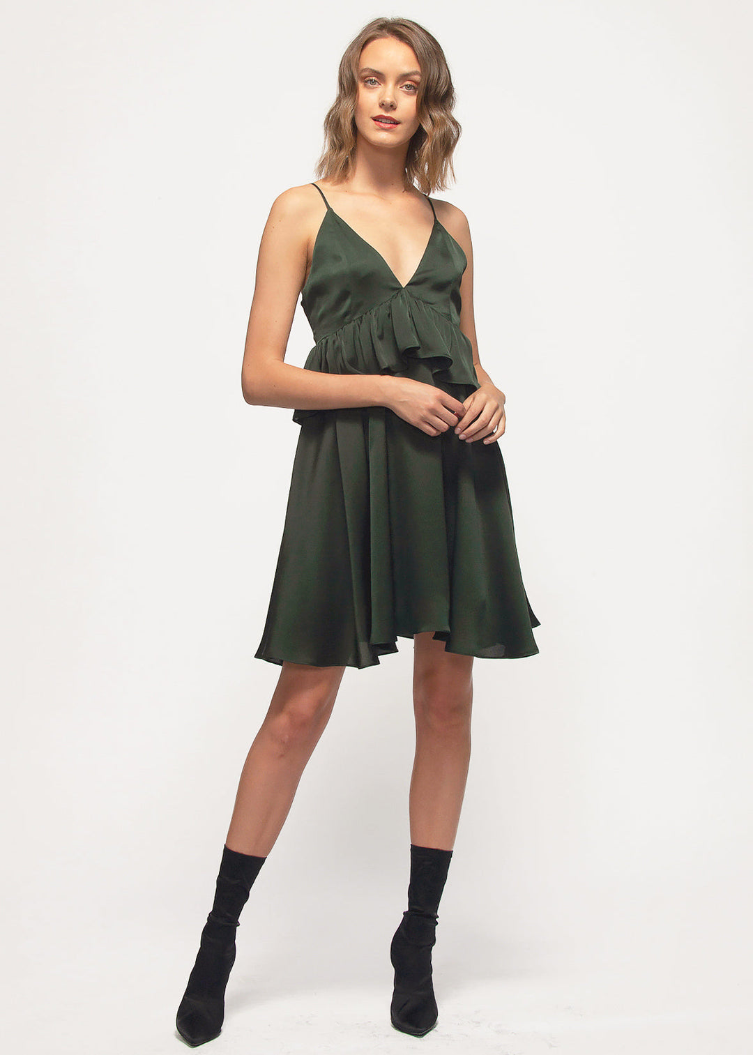 Deep V-neck Ruffle Baby Doll Dress In Hunter Green by Shop at Konus