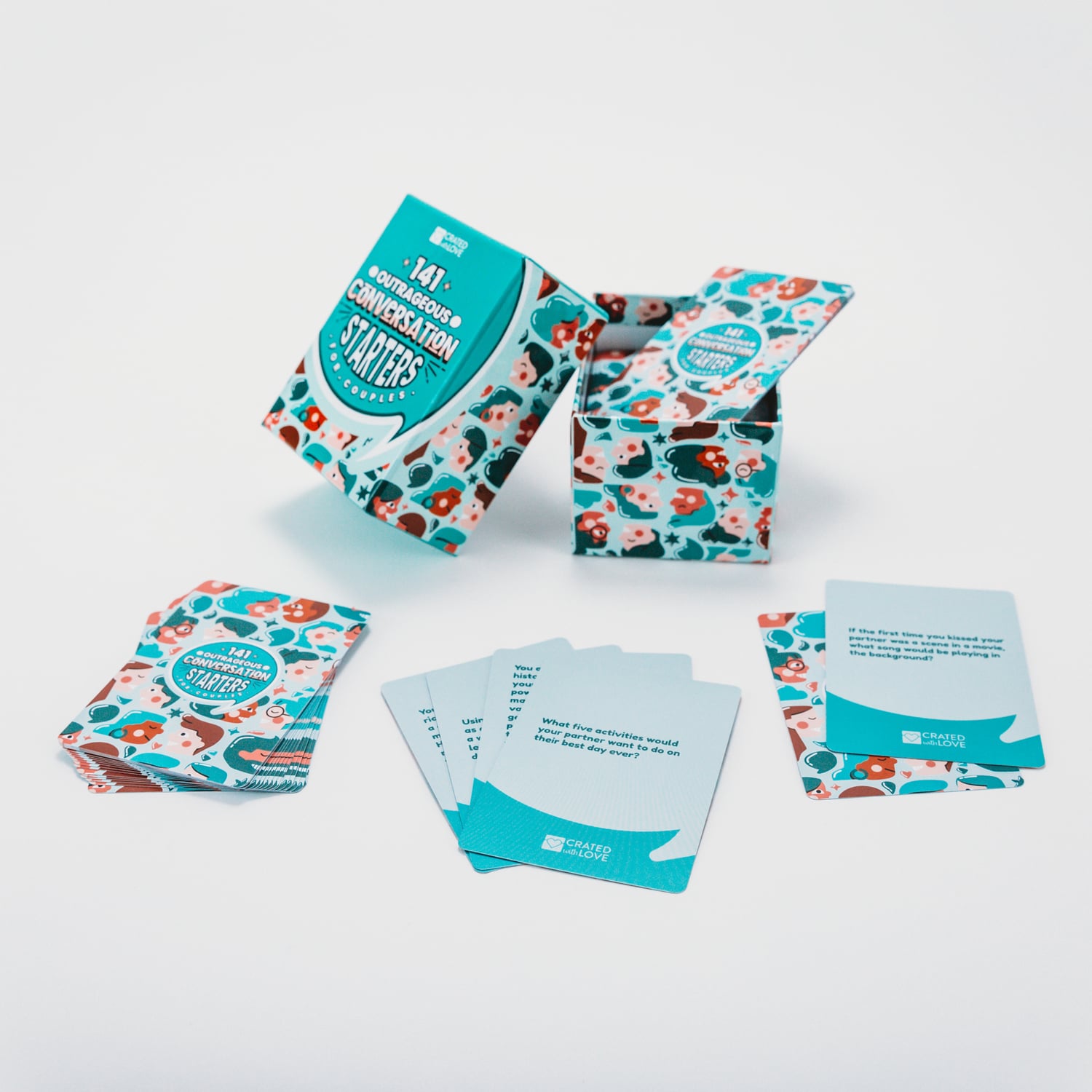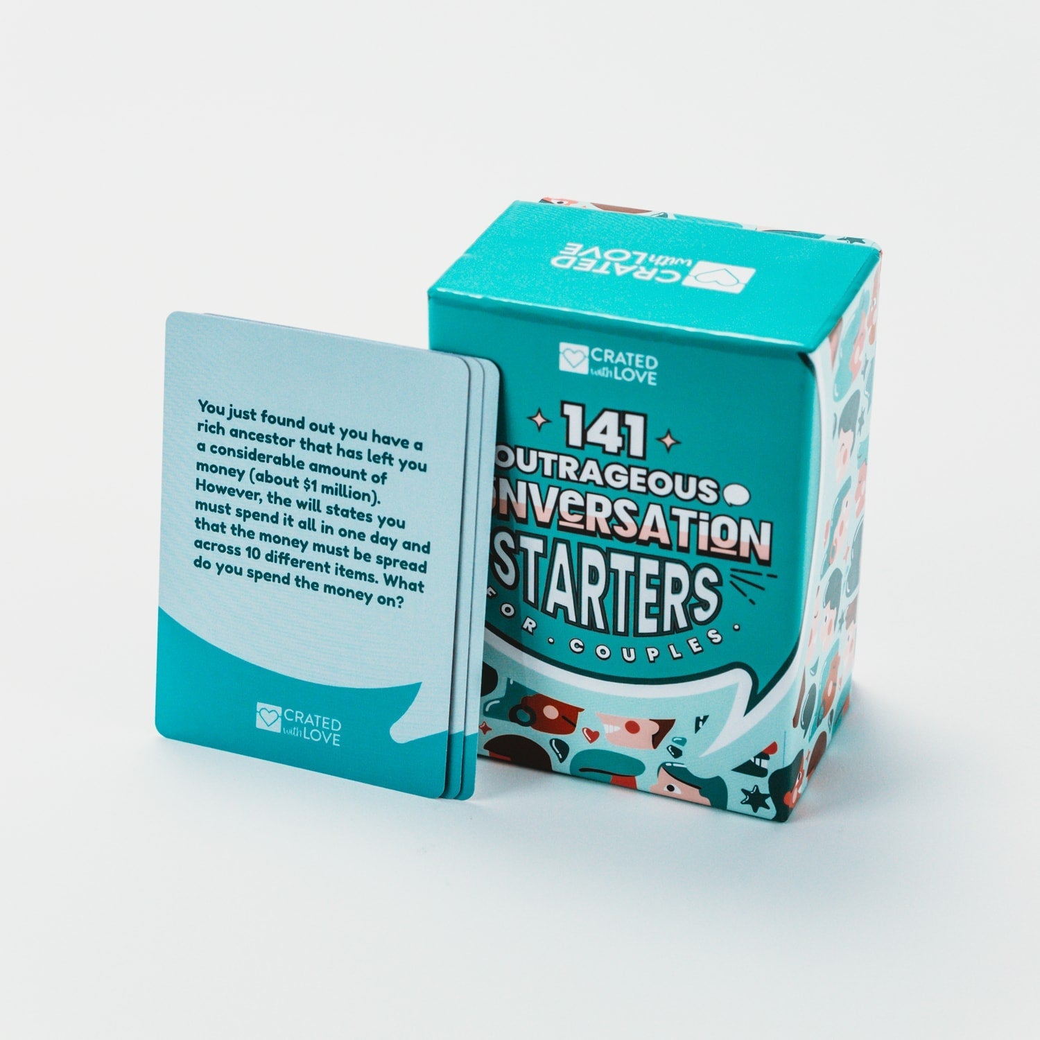 Our 141 Outrageous Conversation Starters for Couples deck is specifically designed by relationship experts to help grow your relationship by learning more about each other and gaining a greater appreciation of your partner.