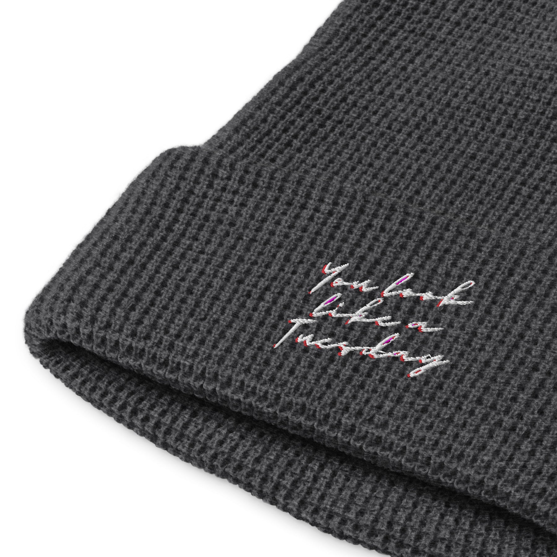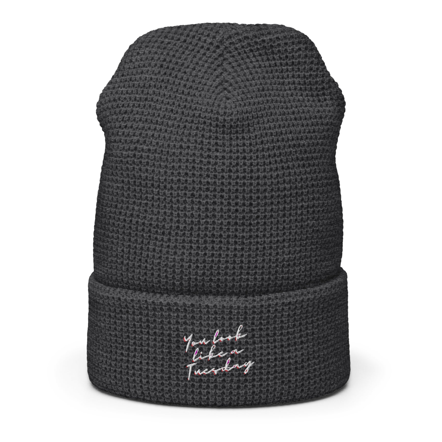 'You Look Like A Tuesday' Made with a unique honeycomb-like weave, this waffle beanie will help you stay warm on all your outdoor adventures. Thanks to an adjustable cuff and flexible material, it’ll fit snugly on your head while hiking, camping, or more!